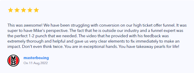 Even if you get 0 value in this service and feedback you will at least have a video explaining how I would overhaul your funnel and create a split test variation to test against your control.